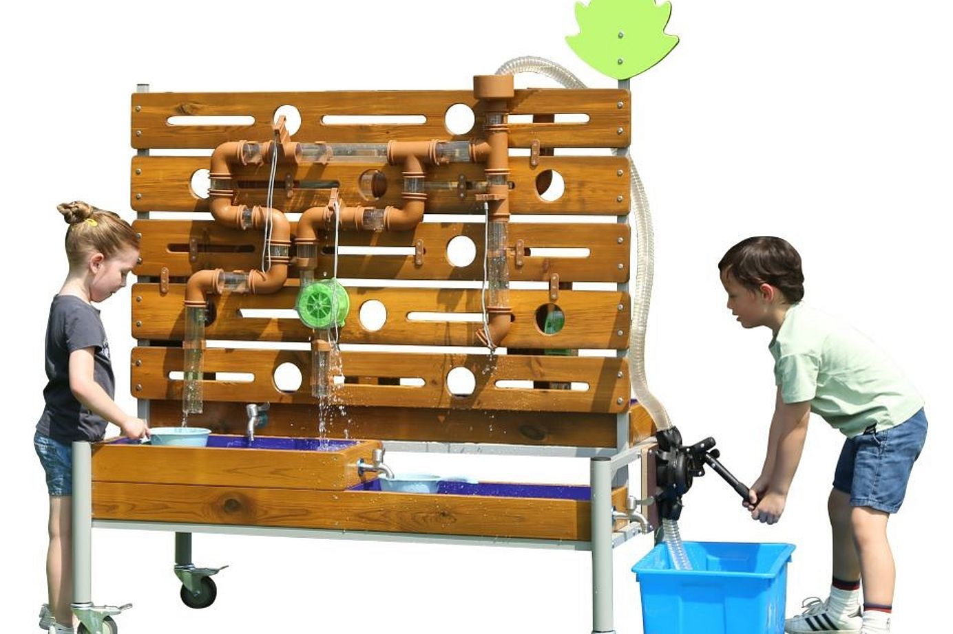Die Wasserspielanlage besteht aus flexiblen Elementen wie Pumpen, Rinnen, Staustufen und Wasserrädern. Kinder können eigenständig experimentieren, Wasserläufe bauen und spielerisch erleben, wie Technik und Natur zusammenwirken.