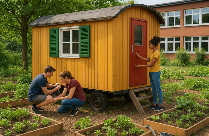 Unser Projekt beinhaltet den Ausbau eines Bauwagens durch unsere Lernenden für den Schulgarten. Der Bauwagen soll dazu dienen, Schülerinnen und Schülern einen Wohlfühlort zu geben, an und in dem sie eigene Projekte planen und umsetzen können. Zusätzlich soll der eigene Ausbau ihnen Selbstwirksamkeit erlebbar und Schule zu einem Ort des Handelns und Schaffen machen.